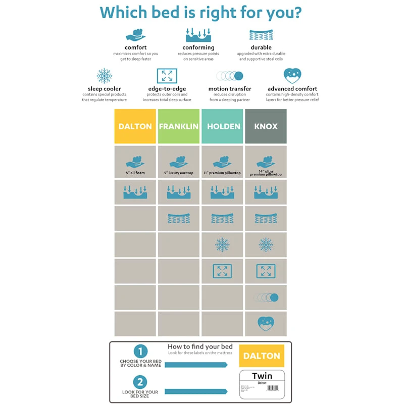 Since we spend a big majority of time sleeping or wishing we could go back to bed, it�s best to have the perfect mattress. Our 14-inch Knox mattress features a thick jumbo pillow top with advanced comfort that�s designed to hug your body in all the right places. This is our only mattress that features a fabric encased, pocketed coil which helps to eliminate partner movement, supports your back and creates an additional layer of comfort to enhance your sleep. Another highlight, every coil is wrapped up in our foam encased edge system that allows you use the entire surface of the bed. Made in the USA.