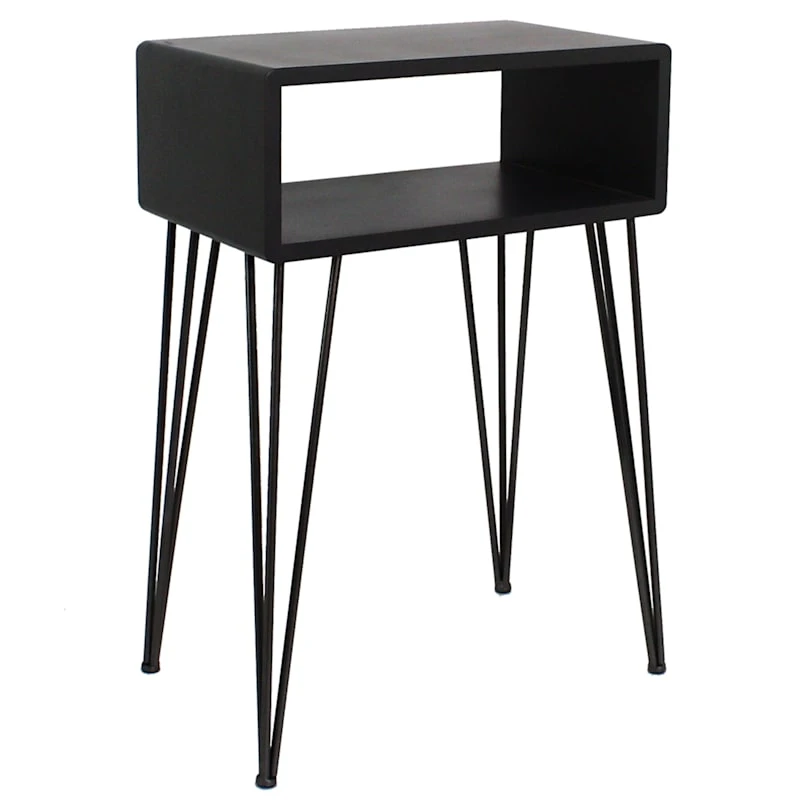 Our open storage accent table merges contemporary with mid-mod, creating a striking and useful furniture piece. Crafted of wood and manufactured wood with wonderful hairpin legs, this small end table will add a sense of timeless history to any space. This piece offers a dramatic focal point and will blend beautifully with a range of decorating styles.