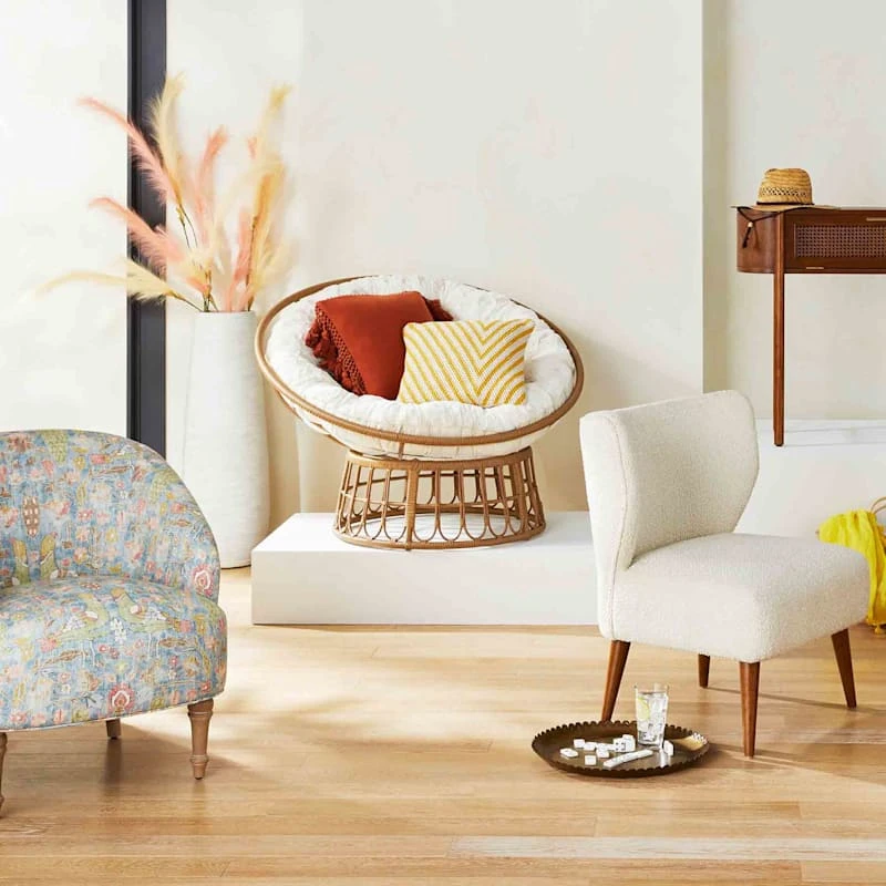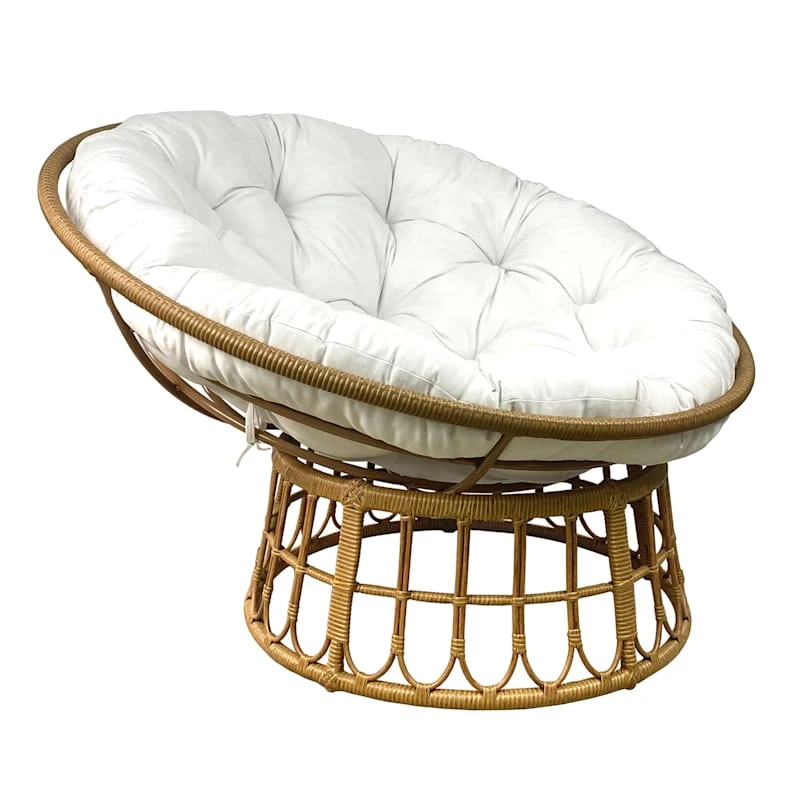 Add a touch of comfort to your home with our all-weather wicker Papasan chair with cushion. Designed with a sturdy steel frame and faux wicker details, this bowl chair features a soft tufted neutral seat cushion to create an inviting nest to relax in. Create a cozy and casual vibe in a bedroom, living room or playroom.
