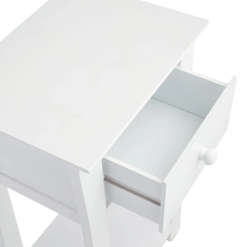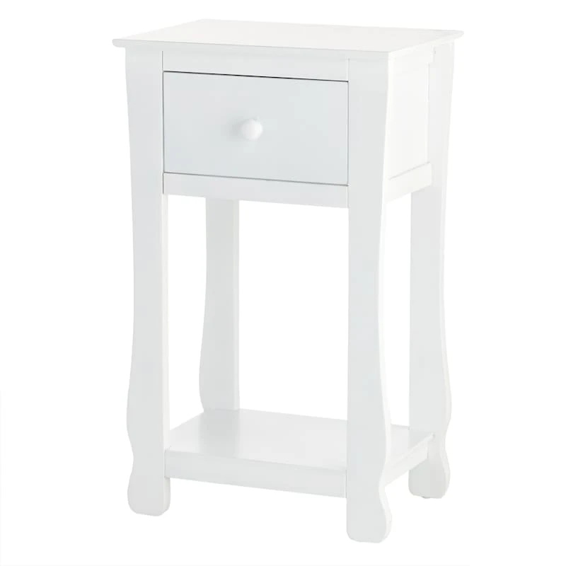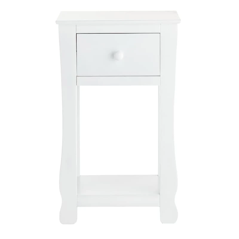 This single drawer end table makes it super convenient to snuggle up on the couch with a journal and a snack, or to settle into bed with tea and a book! Have everything you need within reach with this white accent table with drawer! Place a plant, decorative piece, or magazines on the bottom shelf and a reading lamp on the top. Or top it with a cluster of LED candles for cozy nights. Whatever your style, with its white color and solid, streamlined build, this table can easily become a part of your go-to relaxation nook!