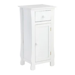 This small white cabinet with drawer, button knobs and curved shape is the cutest addition to any style of decor! Get creative by dressing it up with a vase or a plant. Use it in the living room to store stationery (never lose a pen again!) or other small items in this end table with storage drawer. Place books in the cabinet and a lamp on top, and you have a sweet reading spot! Want to use it to dress up your bedroom? Go ahead! Kitchen? Do it! With this handy accent table, the possibilities are endless!