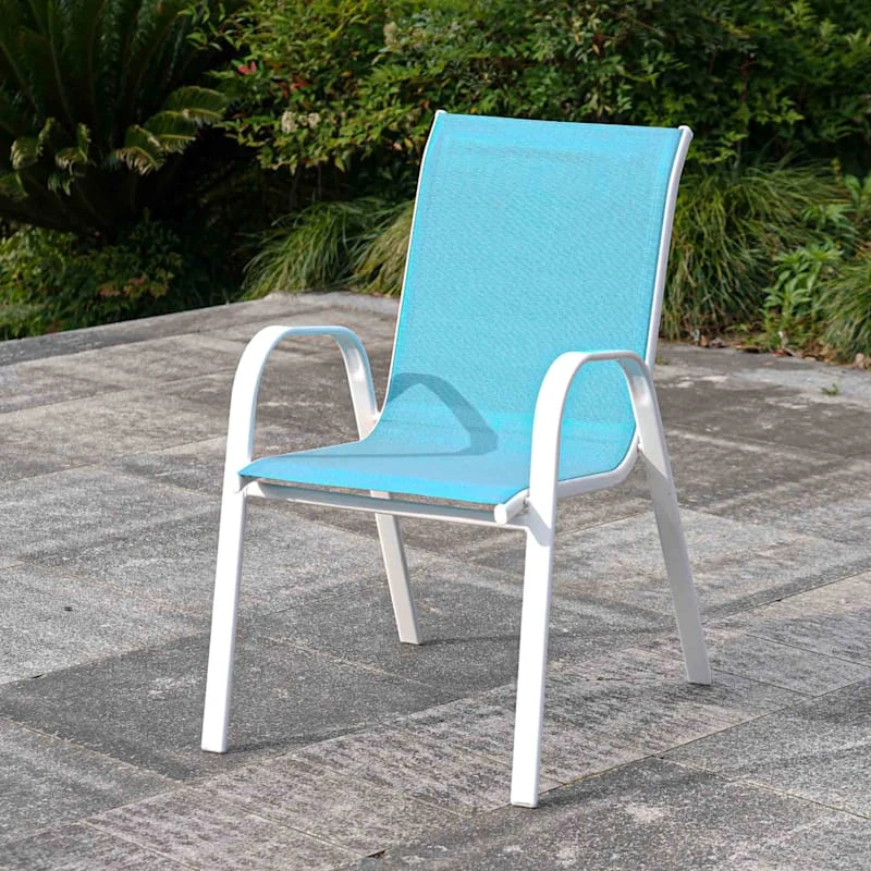 Escape the indoors and get outdoors with our stackable aquarelle blue and white sling patio chair. Buy in multiples and be sure to have enough outdoor seating for family and friends. This outdoor metal dining chair features a simple streamlined look with a white metal frame and a comfortable mesh fabric that’s breathable. These stacking chairs will last even longer if protected from the elements. Pair with any patio table or garden stool and enjoy the great outdoors to the fullest.