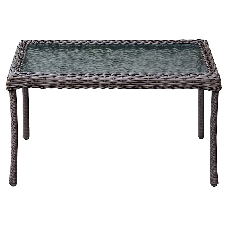 This wicker table can serve as an outdoor side table, sofa table… whatever you choose. Our brown synthetic wicker coffee table is supported by a sturdy metal frame and features a tempered glass top. The all-weather wicker is waterproof and withstands the sun without fading.