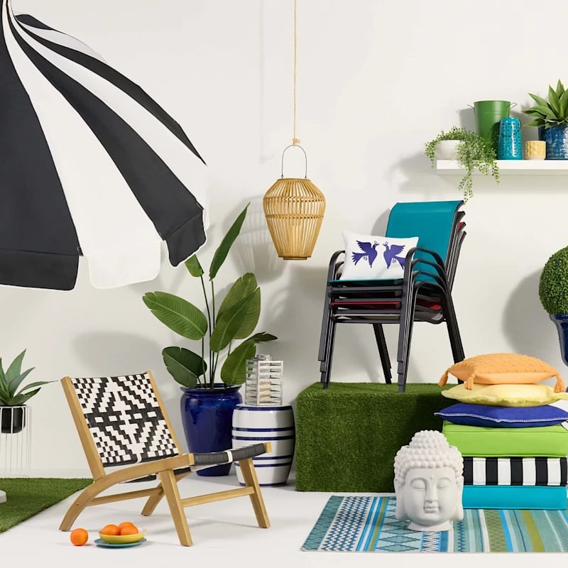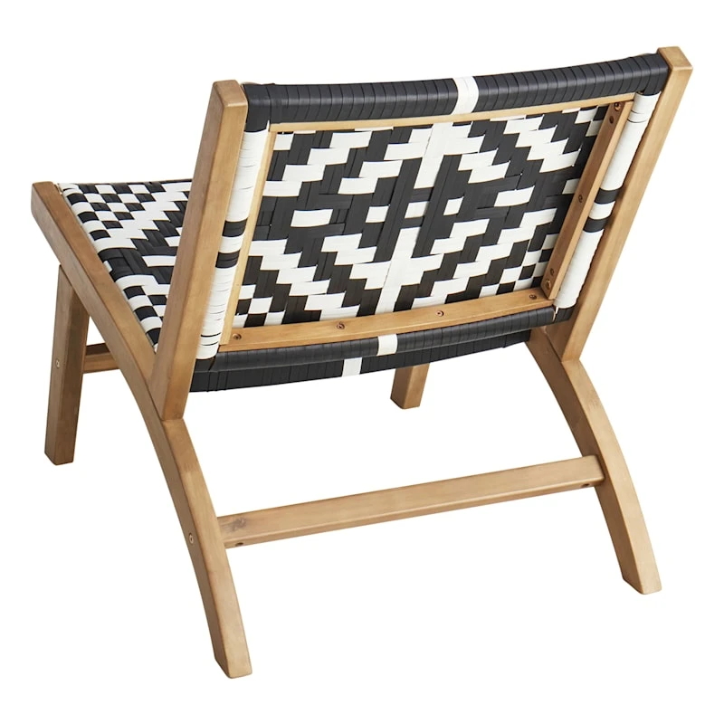 Award-winning London-based fashion designer, illustrator and innovator Tracey Boyd has created an exclusive collection for At Home. Create a relaxing oasis in your backyard where you can just hang and chill. Our Maya black and white armless outdoor chair is made of natural wood and black and white patterned synthetic wicker woven in a cool design perfect for your outdoor space. An interesting modern design, this lounge type chair will be welcome in any outdoor space.